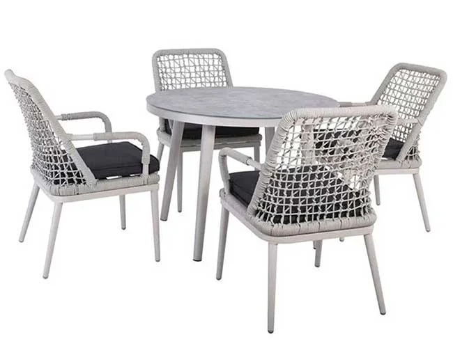 Το Σετ Τραπεζαρία Ecco-Moritz είναι μία κορυφαίας ποιότητας και αισθητικής επιλογή τόσο για σπίτια όσο και για επιχειρήσεις. Η άριστης ποιότητας κατασκευής του το καθιστά κατάλληλο για εσωτερικούς, αλλά και για στεγασμένους εξωτερικούς χώρους. Διαθέτει φανταστικό design που θα το λατρέψετε και θα αποσπάσει τα θετικότερα σχόλια των επισκεπτών σας. Το σετ αποτελείται από ένα τραπέζι και τέσσερεις πολυθρόνες. Το τραπέζι διαθέτει σκελετό από αλουμίνιο και επιφάνεια από γυαλί ασφαλείας (tempered glass) 5mm, που είναι ανθεκτικό στις συνθήκες του εξωτερικού περιβάλλοντος. Οι πολυθρόνες έχουν σκελετό από αλουμίνιο, πλάτη από textilene σχοινί, ανθεκτικό στις ακτινοβολίες UV και μαξιλάρι για το κάθισμα με foam 5 cm, με αφαιρούμενη επένδυση από πολυεστέρα. Στοιβάζονται εάν αφαιρέσετε τα μαξιλάρια, ώστε να τις μετακινείτε και να τις αποθηκεύετε ευκολότερα.